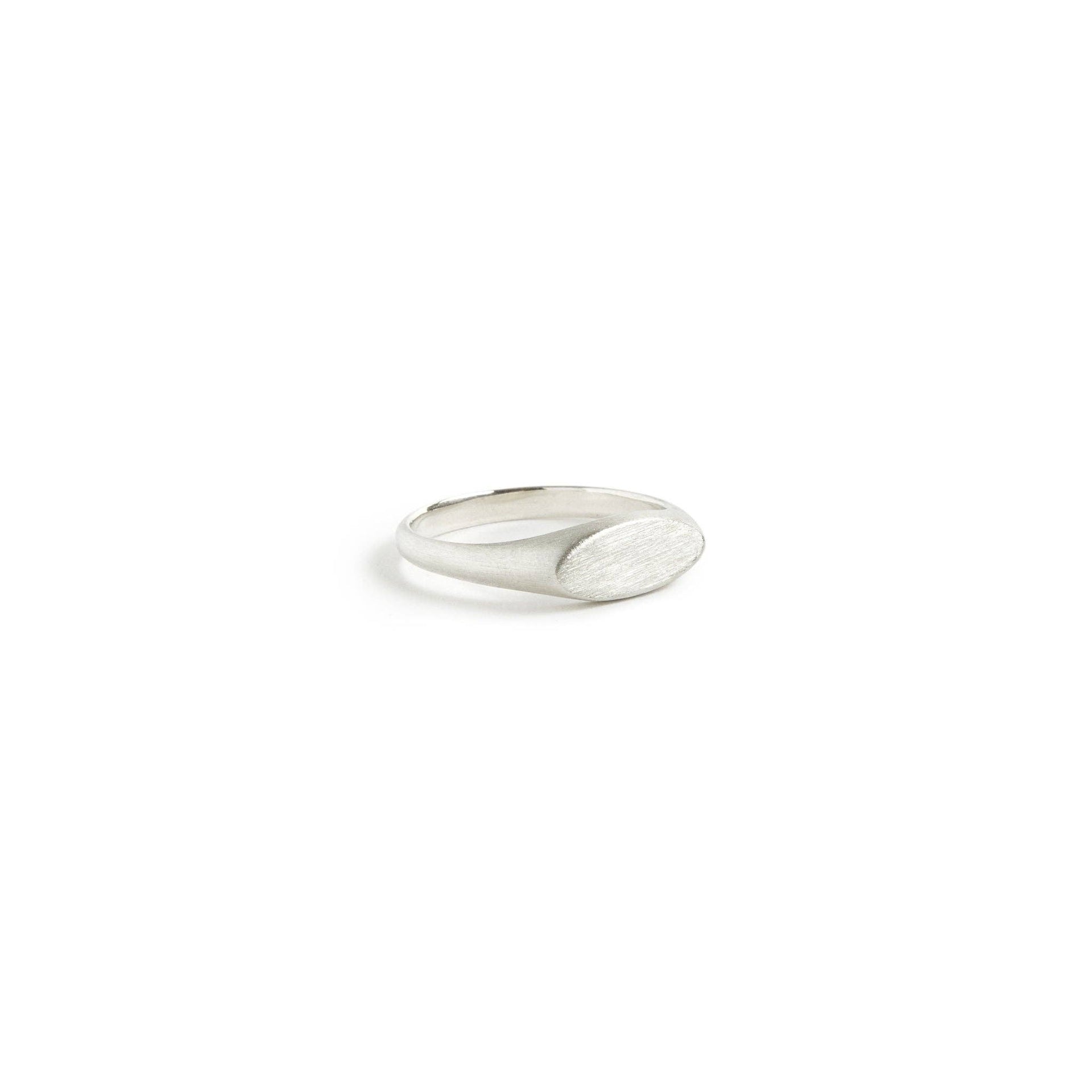 Crafted from solid sterling silver, this refined signet ring features a streamlined matte face measuring approximately 5.5mm x 13mm (proportions based on size 9). The interior is stamped with Studebakers signature crossed hammers mark and authenticated with a .925 hallmark, confirming its sterling silver composition. A sophisticated, minimalist design that balances understated elegance with enduring quality.