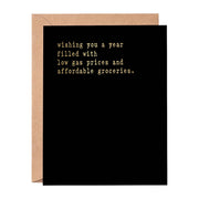 Ring in 2026 with a hilarious dose of reality and well wishes by sending your friends and family this humorous happy new year card. It reads: "Wishing you a year filled with low gas prices and affordable groceries."