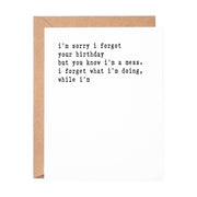 This belated birthday card is so funny it makes forgiving you easier. It reads: "I'm sorry I forgot your birthday but you know I'm a mess. I forget what I'm doing while I'm."