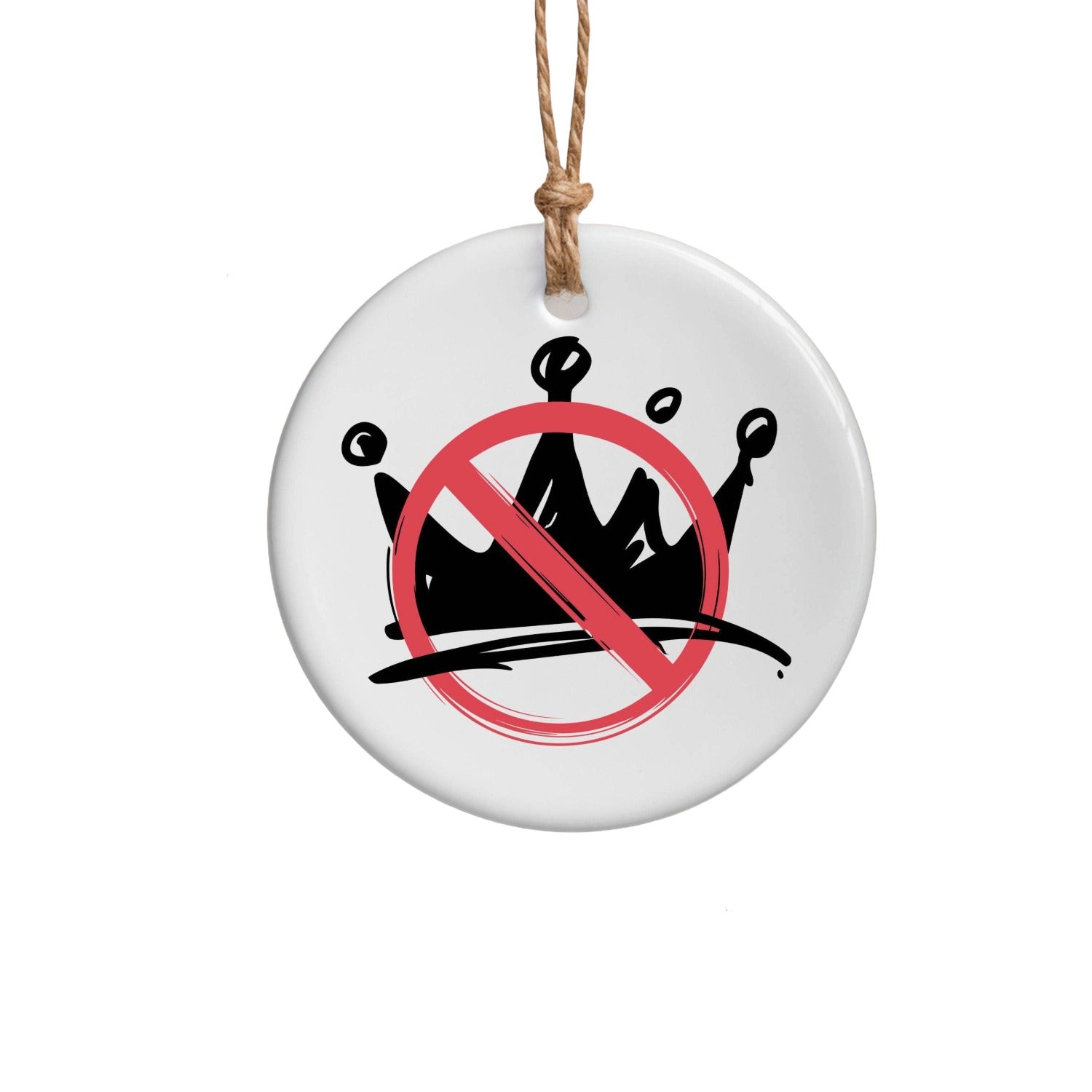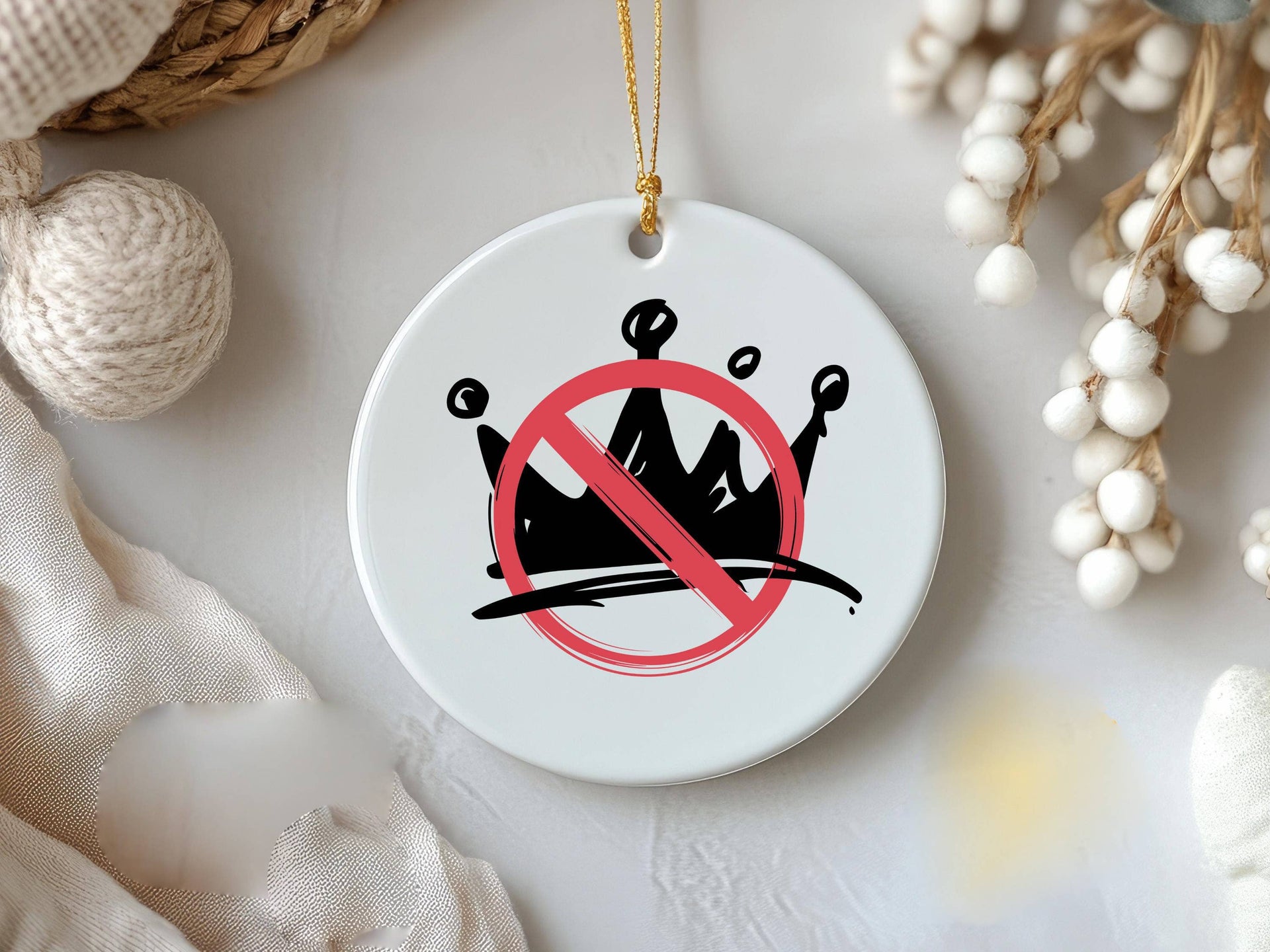 Bring artistic flair to your holiday display with the No Kings Ornament. This charming ceramic piece features a striking two-sided design rendered in vibrant, fade-resistant HD inks that pop against the ceramic finish. Measuring 2.9" x 2.9", it's crafted from premium white ceramic with a smooth, elegant surface. The ornament arrives ready to hang with three stylish options—gold metallic, red ribbon, and natural jute twine—so you can match any tree aesthetic. A conversation starter that transforms your seasonal décor into something truly special.
