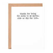 This Snoop and Martha funny friendship card is the perfect way to let the homies aka your BFFs know how much they mean to you. Whether it's for Galentine's Day or just because, if you have a ride or die, this is the thinking of you card to roll with. It reads: "Thanks for being the Snoop to my Martha. Ride or DIY 4 life."