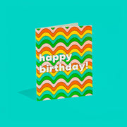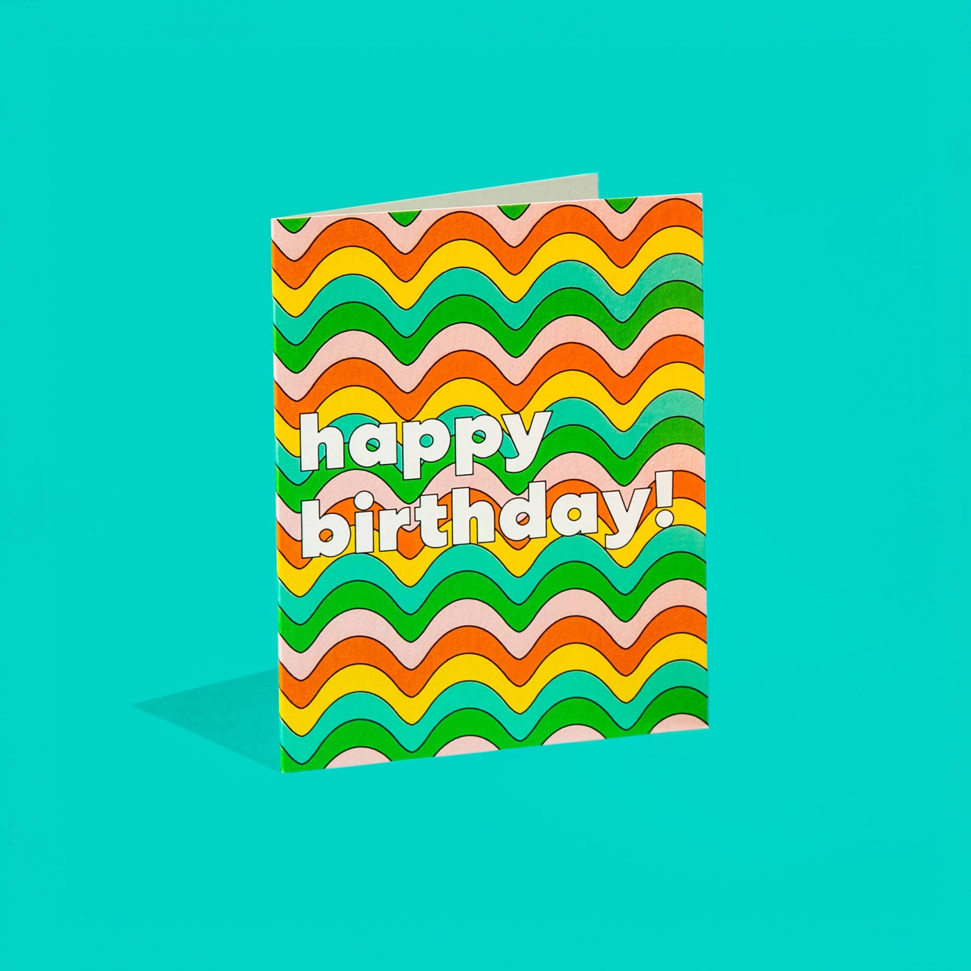Bring the good vibes with this retro birthday card featuring bold wavy stripes and a vibrant 70s-inspired palette. Perfect for customers who love colorful, design-forward stationery with a dash of vintage flair.