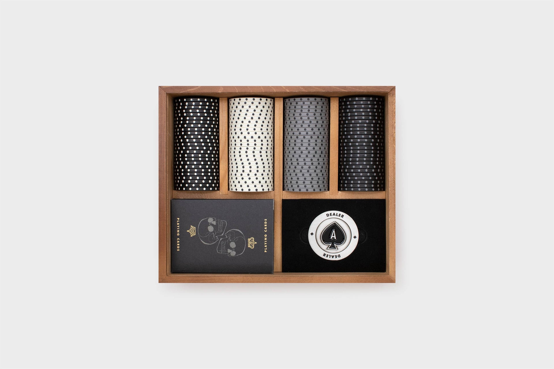 Elevate your game night with the Dead Man's Hand Poker Set. This deluxe wooden presentation box holds a full deck of playing cards, 100 custom poker chips, and a sleek metal dealer chip. Perfect for poker pros and novices alike, it brings style and fun to every round. Get ready to deal out excitement and maybe even a little friendly bluffing!
