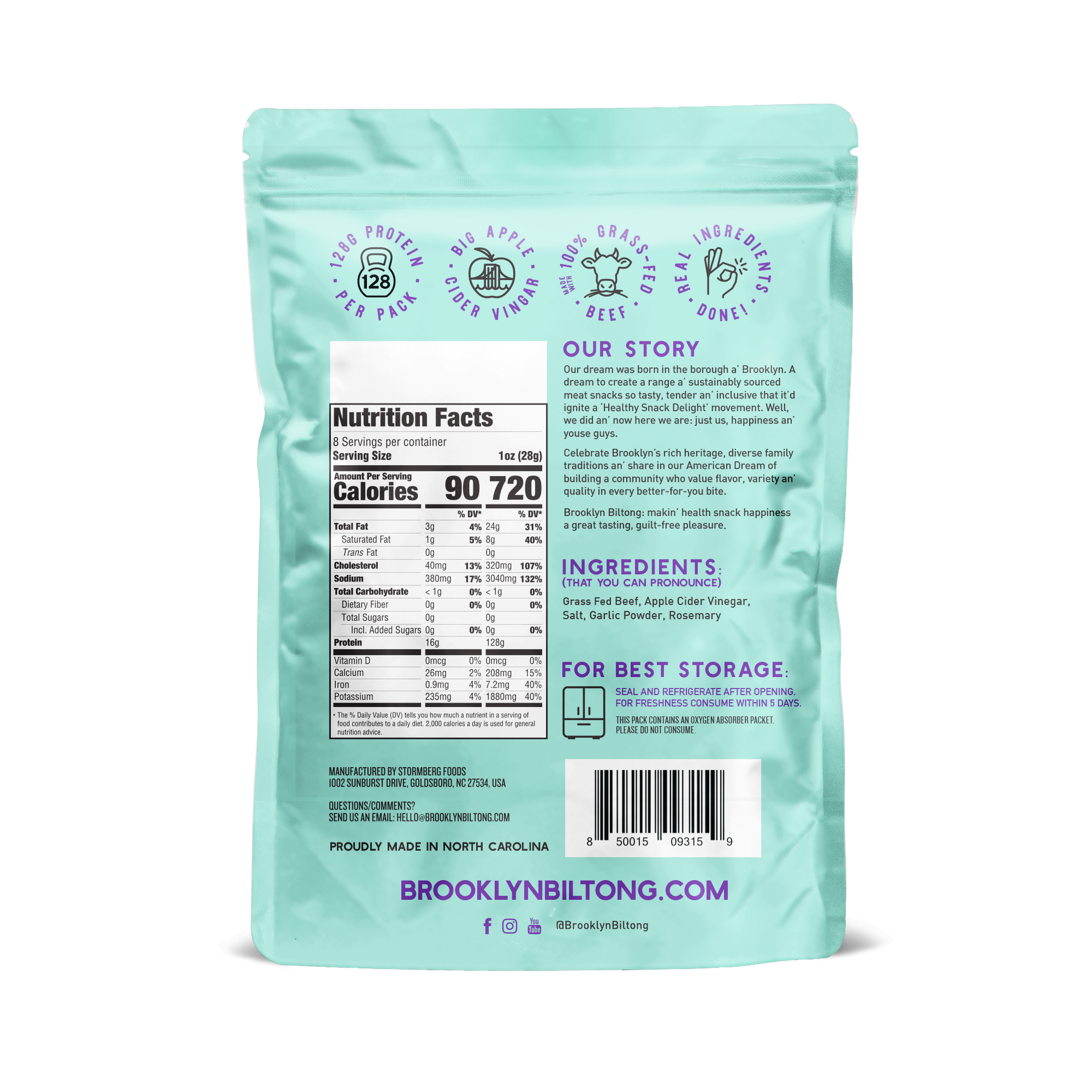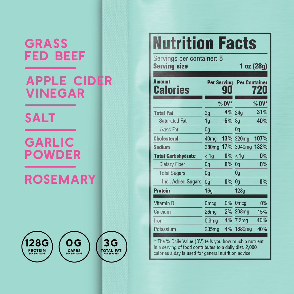 Tender strips of beef with a recipe brimming with garlic and paprika, named after the vibrant city nicknamed "Steakhouse". South Africa's version of beef jerky. But it is oh-so-much more. Dried slowly to maintain tempting mouth-watering flavor. Marinated with spices like garlic and black pepper, with vinegar for maximum tenderness and even more taste bud joy. There are zero sugars, no corn syrups, and no artificial preservatives. It is Paleo friendly.