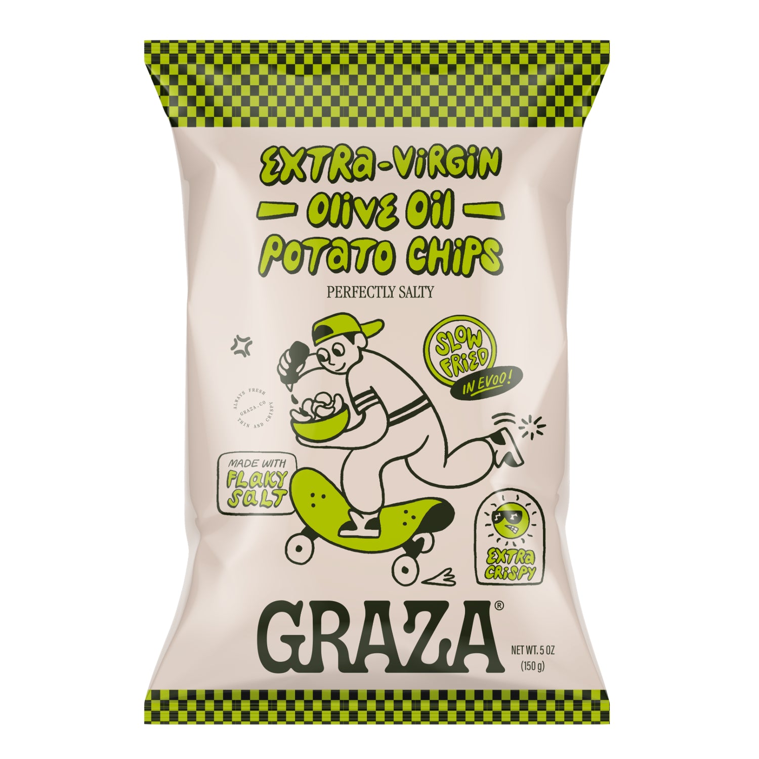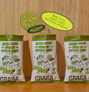 Extra crispy and perfectly salty. Slow-fried in “Sizzle” extra virgin olive oil for maximum crunch and flavor. These EVOO potato chips are made with super tasty Galician potatoes and flaky salt from the 6,000 year old Añana salt flats. Pretty cool, huh?!