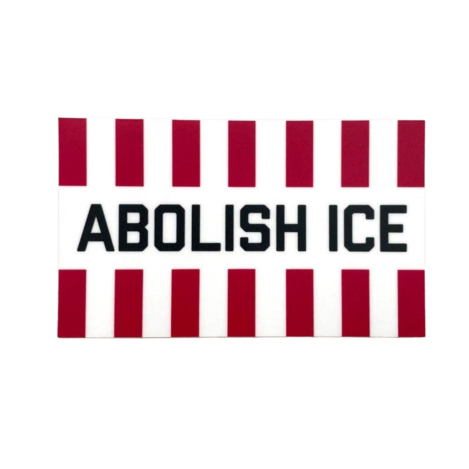 The words "ABOLISH ICE" appear in red and white stripes that cleverly mimic jail bars, in this vinyl sticker reminiscent of the current times