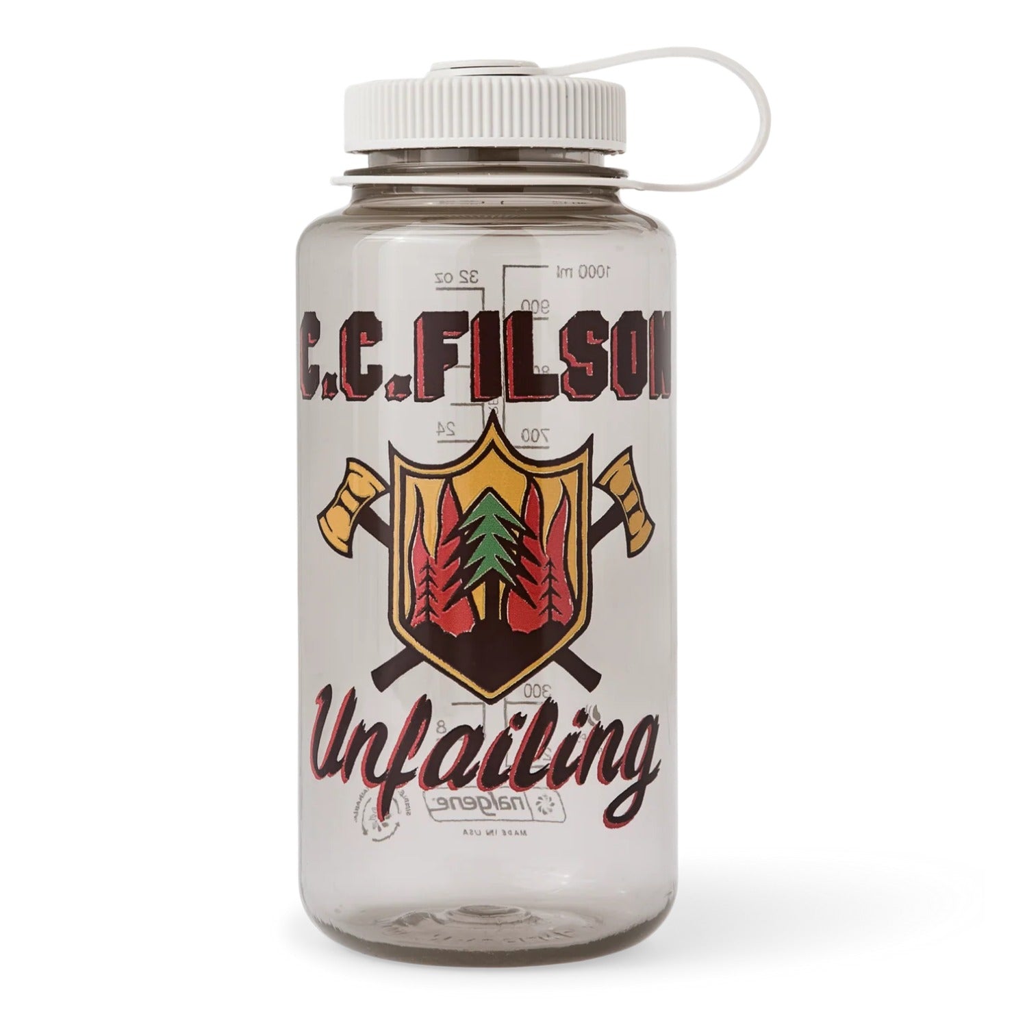 A staple for anyone outdoors, this 32-oz. Nalgene Bottle is shatterproof, dishwasher-safe, and suitable for hot and cold beverages. Made with completely BPA-free plastic that doesn't leach harmful chemicals into your water. Features a wide mouth that's compatible with many water filters and a loop-top design to keep the lid tethered. Limited-edition Filson graphics.