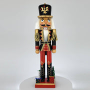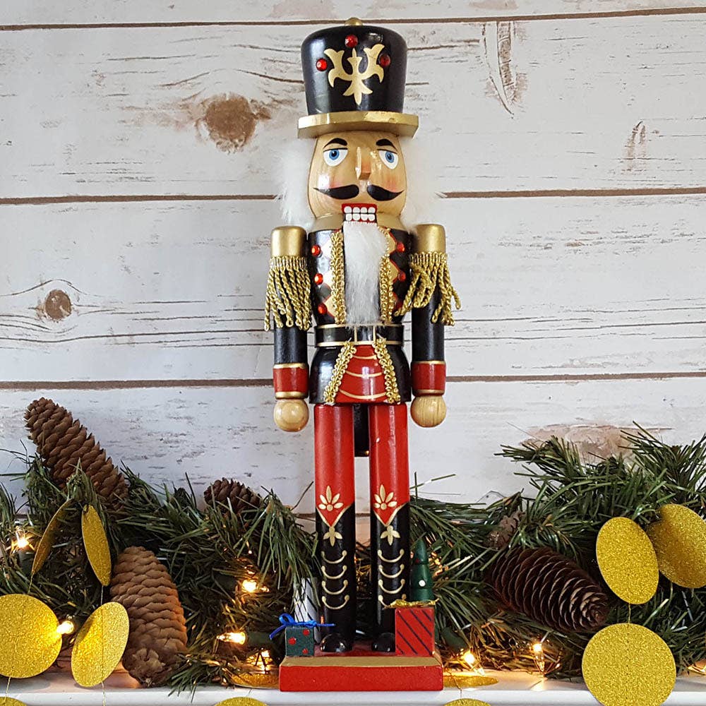 A 15 inch gift-bearing Nutcracker Soldier for you this holiday season! He stands tall on a red and gold platform, with three presents and a tree by his side. Gold shoulders with hanging gold tassels give this nutcracker's black jacket some extra punch! Red pants with black boots complete this posh design. Black mustache and eyebrows, sleepy colorful eyes. This handmade nutcracker makes a wonderful gift or collector's item. Act now to put him under your tree.