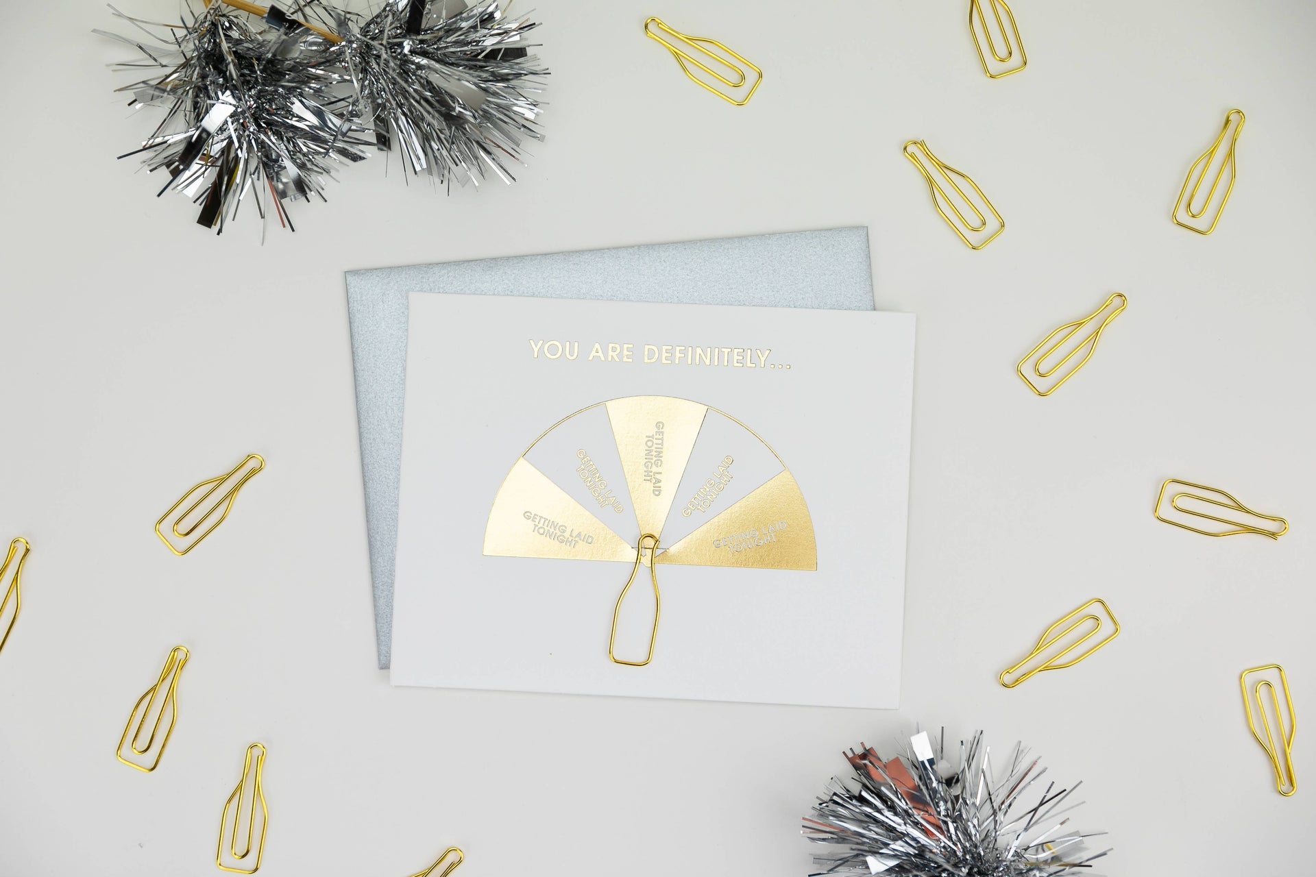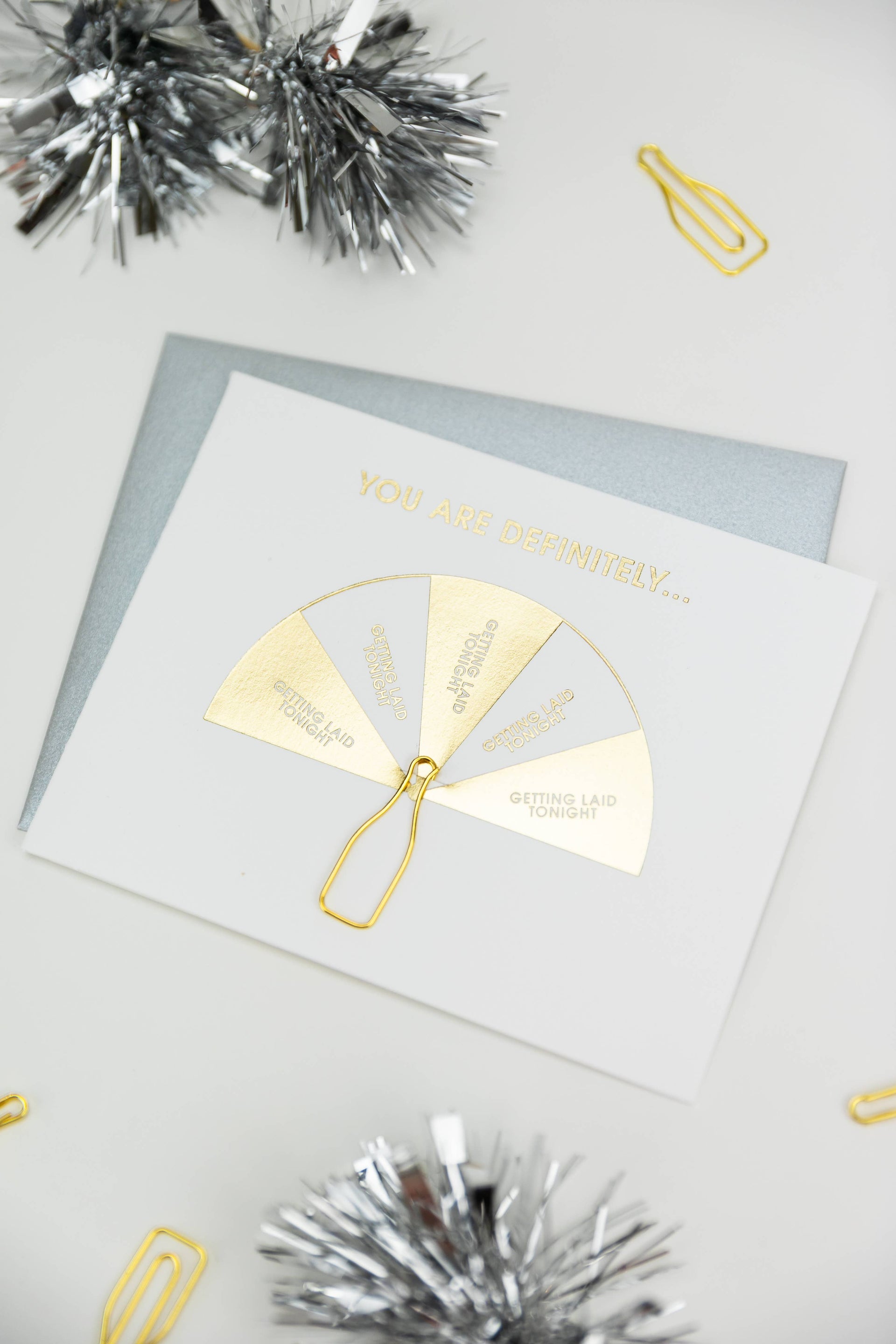 Turn up the heat with our “Spin the Bottle: Getting Laid Tonight” card—perfect for cheeky birthdays, bachelorette parties, or flirty celebrations. Letterpress printed on luxe tree-free paper in shiny gold foil, this bold card comes with a reusable gold bottle paper clip that can hold cash, a gift card, or be saved as a keepsake.