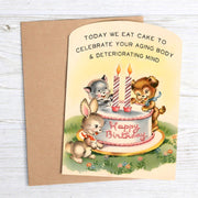 Celebrate the gift of getting older with a humorous twist with the "Today We Eat Cake to Celebrate Your Aging Body & Deteriorating Mind" greeting card! This funny card is perfect for birthdays that calls for a lighthearted nudge about the inevitable challenges of aging.