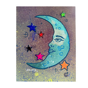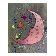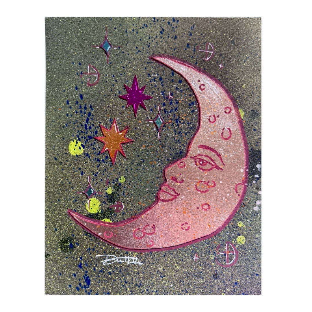 Reach for the stars with this whimsical crescent moon painting by Little Rock artist Daniel Hale. Set against an abstract background, a luminous moon takes center stage while colorful gilded stars dance around it, creating a dreamy celestial scene. Perfect for adding a touch of cosmic charm and artistic flair to any room, this piece brings together playful creativity and sophisticated detail. A stellar addition to art lovers' collections.