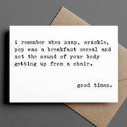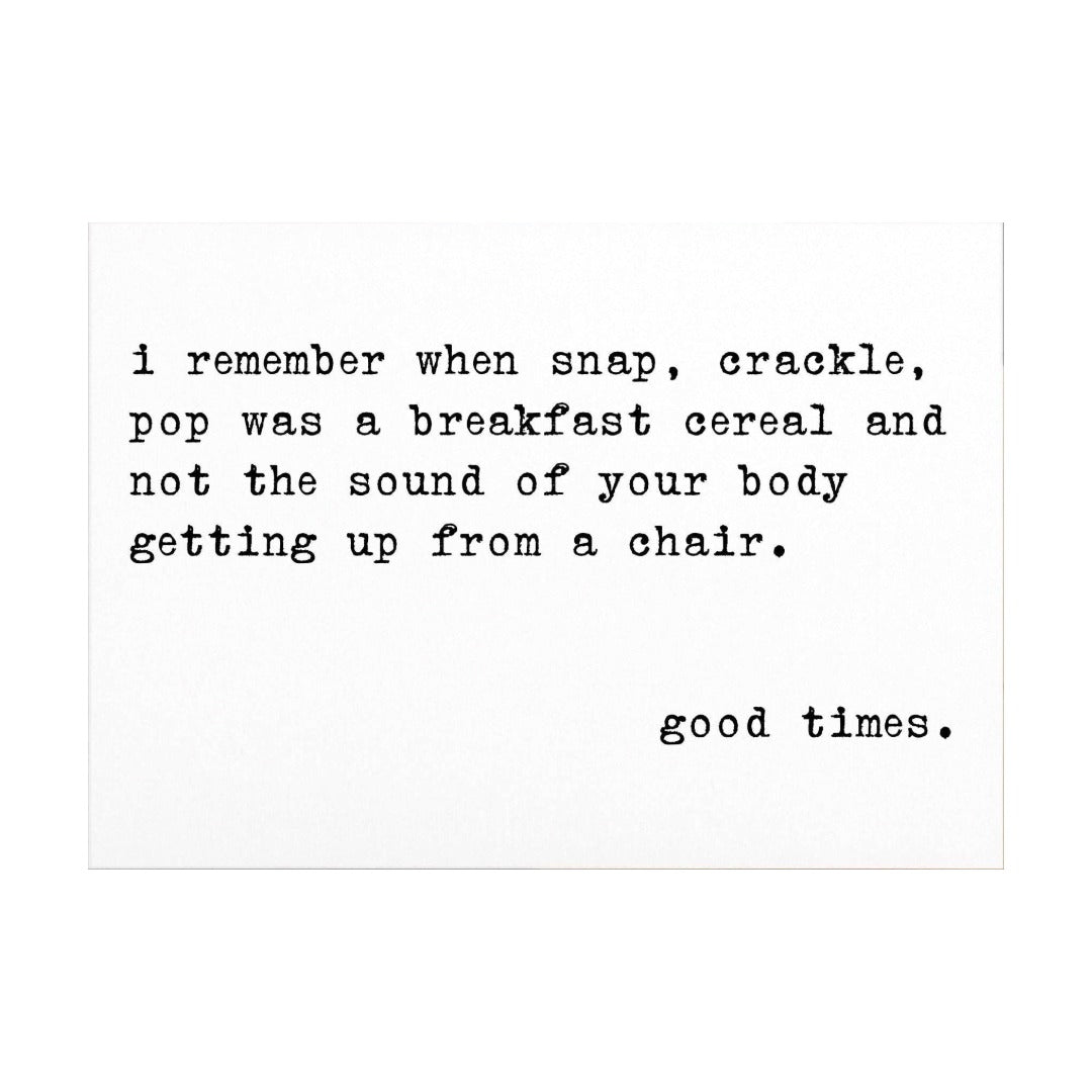 I remember when snap, crackle, pop was a breakfast cereal and not the sound of your body getting up from a chair. Good times.